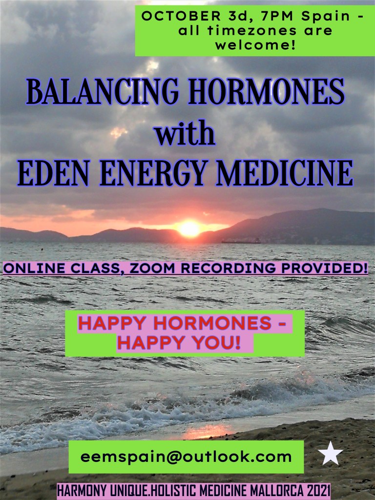 Hello, my friends! Presenting my NEW online class, coming up October 3d, Sunday, 7 pm Spain. “Balancing Hormones with Eden Energy Medicine”!